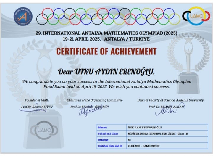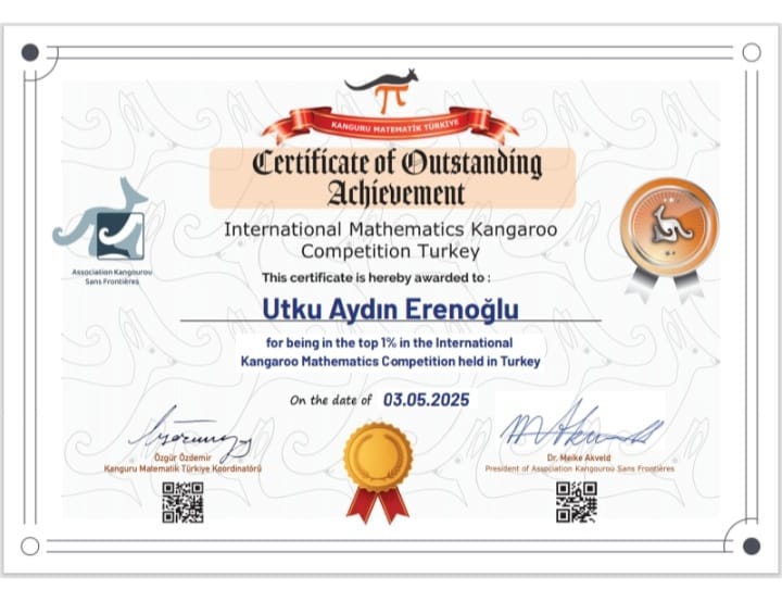 • Kanguru Matematik Türkiye ve Antalya Uluslararası Matematik Olimpiyatları‘nda derece