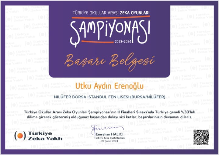 • Türkiye Zeka Oyunları Şampiyonası’nda ülke genelinde ilk %30’luk dilimde yer aldı.